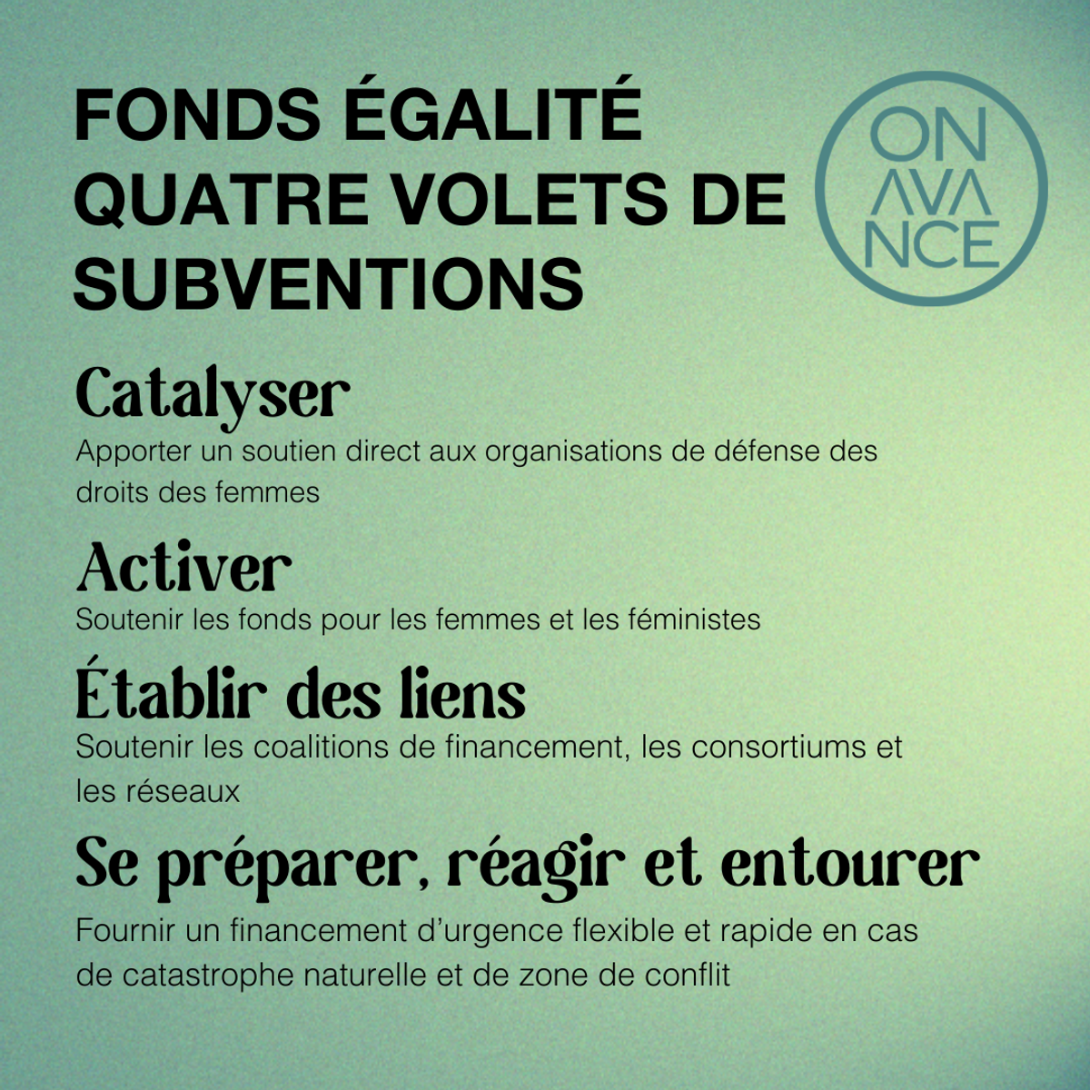 Nous reconnaissons faire partie d’un écosystème croissant de bailleurs de fonds féministes et nous mettons cela à l’honneur. Notre objectif est de renforcer et d’accélérer le développement dynamique de cet espace en augmentant de manière exponentielle les investissements dans les organisations de défense des droits des femmes et les mouvements féministes œuvrant depuis la base jusqu’à la scène régionale et mondiale. Nous proposons quatre volets de subventions pour soutenir ces organisations et ces mouvements :