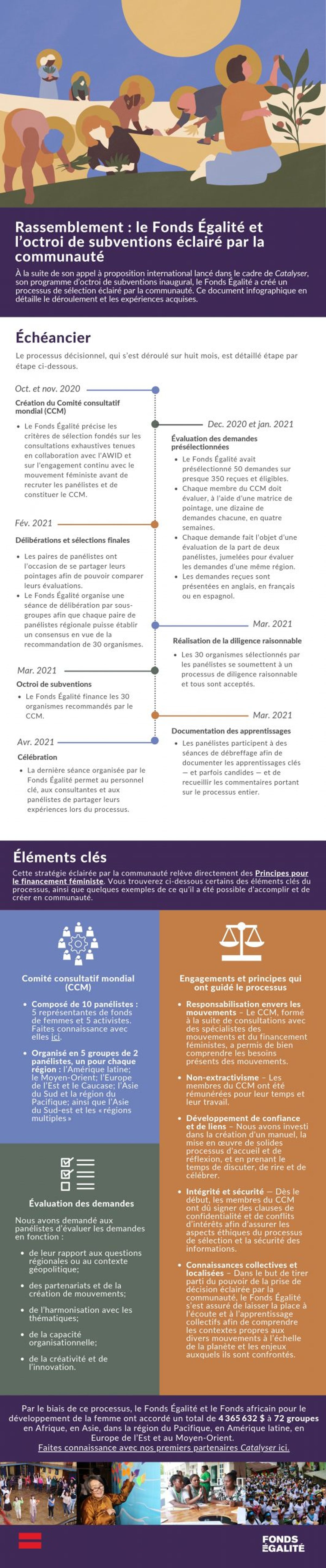 Le document infographique suivant illustre bien les étapes chronologiques du processus. On y détaille la mise en œuvre du premier processus participatif d’octroi de subventions et ses éléments clés, ainsi que les principes nécessaires à sa prestation dans le respect des valeurs féministes du Fonds Égalité.