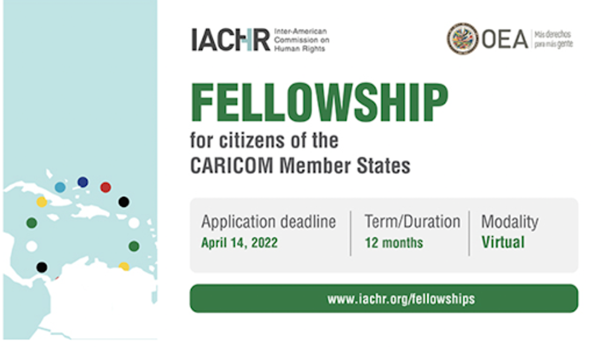 IACHR invites young professional lawyers from the States of Antigua and Barbauda, Bahamas, Barbados, Belize, Dominica, Grenada, Guyana, Haiti, Jamaica, Saint Kitts and Nevis, St. Lucia, St. Vincent and the Grenadines, Suriname and Trinidad and Tobago with an interest in human rights to apply for the Fellowship for Human Rights in the Caribbean. Learn more about this opportunity here!