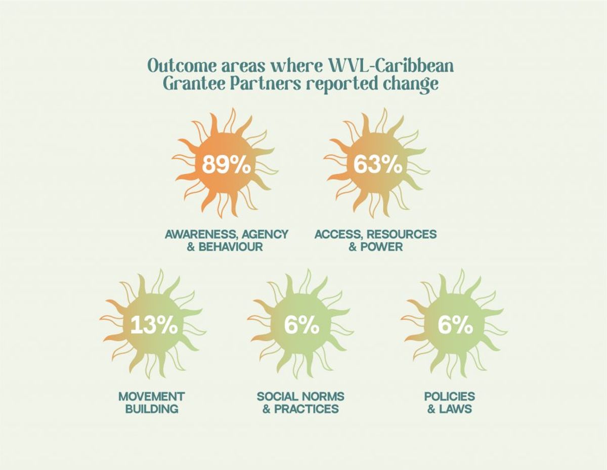Approximately 89 percent of WVL-Caribbean grantee partners reported changes in awareness, agency, and behaviour as a result of their programs and interventions, which enabled more women, girls, and trans people to claim their rights at an individual or collective level. In addition, 63 percent of grantee partners were able to advance changes in access and resources so that more women, girls, and trans people’s well-being and power are increased through access to high-quality services, resources, and participation in decision-making spaces.